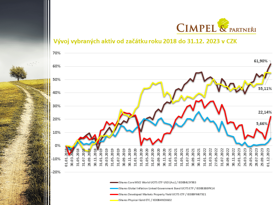 Dan: Z dlouhodobého pohledu můžeme vidět, že na americkém a světovém indexu jsme se dostali v podstatě na nová maxima. Koukáme na to v korunovém vyjádření. Ty poslední měsíce byly velmi silné, jak za chviličku uvidíme, víceméně v průřezu všech hlavních aktiv, ať už akcie, nemovitosti… I dluhopisy se malinko zotavily, ale ty ještě mají nějakou cestu před sebou. Za oživením stály hlavně dobré zprávy z pohledu toho, že inflace dál klesá a centrální banky to reflektují zmírněnou rétorikou toho, že by mohly začít směřovat úrokové sazby směrem dolů. Teoreticky by mohly směřovat o něco rychleji, než banky avizovaly v předešlých kvartálech a měsících. To se trochu změnilo v lednu, kdy vyšly docela dobré zprávy z pohledu trhu práce a to ta akciová očekávání trochu uklidnilo. I tak pořád koukáme na prostředí, kdy inflace klesá a jediné, co to pro nás možná znamená, je, že snižování úrokových sazeb nebude tak rychlé, jak z toho byl trh koncem loňského roku nadšený. Uvidíme, jak to bude vypadat dál.