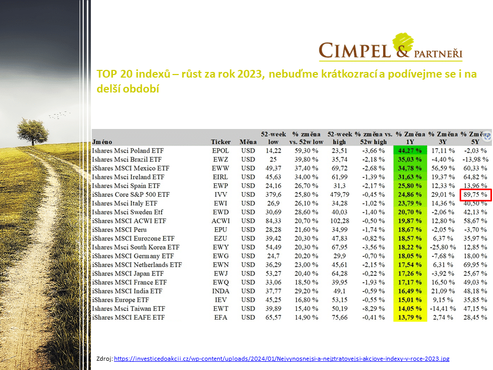 Jiří: Já jsem si na závěr připravil krátký přehled 20 nejlepších indexů za rok 2023, kde je vidíte seřazené od nejlepších až po nejslabší z 20 nejlepších :-) Co mě na tomto seznamu zaujalo, je, že když se podíváte na dlouhodobý trend, tak úplně nejlepší z nich je index S&P 500. Tohle je docela pozitivní zpráva, protože pro atraktivní růst nemusíte za každou cenu hledat různé exotické nástroje. Často slyším investory, jak se snaží preferovat různé rozvojové trhy, emerging markets ekonomiky atd., protože tam vidí šanci na strmý růst, ale když se pak podíváte v dlouhodobém horizontu, můžete vidět, že tím dlouhodobým vítězem jsou vlastně silné, stabilní, dlouhodobé ekonomiky, které táhnou. Nechci tím teď říct, že máte držet jenom americké akcie, jenom S&P 500. Chci tím primárně ukázat, že pro dobrý výnos nemusíte hledat exotiku a můžete se klidně držet zaběhlých a jistých stabilních vod.