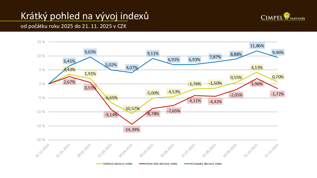 Jiří: Vítám vás u dalšího dílu Aktualit z finančních trhů, dnes se podíváme, jak se dařilo finančním trhům v měsíci listopadu a na některá aktuální témata. Jedním z nich je umělá inteligence a potenciální bublina v tomto sektoru. Podíváme se také na výsledky zprávy Mezinárodního měnového fondu, který měřil vliv jednotlivých ekonomik na globální trh.