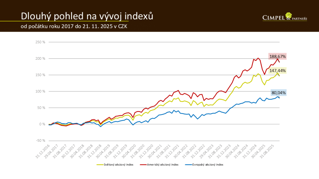 Dan: V delším horizontu šlo o drobné pohyby. Opět vidíme, že v dlouhodobém pohledu se tyto výkyvy poměrně vyhlazují. Americký index je téměř 189 % v plusu, světový index 147 % a evropský index, ačkoliv se mu letos dařilo, je kolem 80 %.