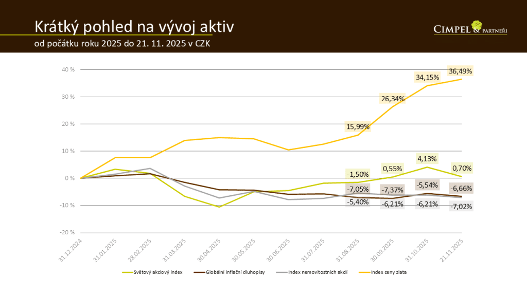 Dan: Minulý měsíc byl velmi zajímavý. V první části, a to až téměř do konce listopadu, byly trhy pod tlakem. Objevily se obavy, že v oblasti AI vzniká bublina. Existovaly pochyby, zda FED na prosincovém zasedání sníží úrokové sazby. A panovaly také obavy o vývoj ekonomik v Číně a Velké Británii. To vše vyvolávalo na trzích nejistotu. Zároveň se řada fondů a investorů snažila realizovat své zisky z průběhu roku.