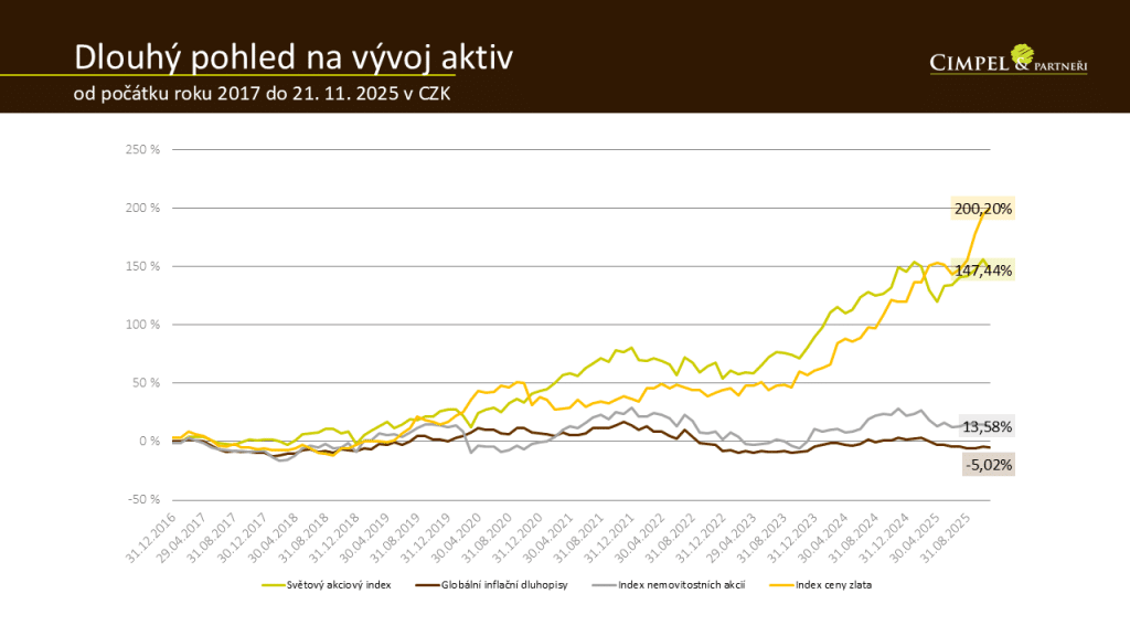 Jiří: Když se podíváme na dlouhodobý vývoj – zlato za posledních 8 let (od roku 2017) vzrostlo o 200 %, akcie o 150 %. Kdybych se podíval na dalších 8 let, věřím, že akcie zase přinesou 1 nebo 1,5násobný růst. Ale na zlato bych svou finanční budoucnost nevsadil. Nevsadil bych na to, že teď koupím zlato a za dalších 10 let bude stát 3x tolik, co dnes. To je rozdíl mezi těmito aktivy, zlato tlačila nahoru nějaká spekulativní bublina, akcie tlačí nahoru růst jejich podstaty, generování zisků.