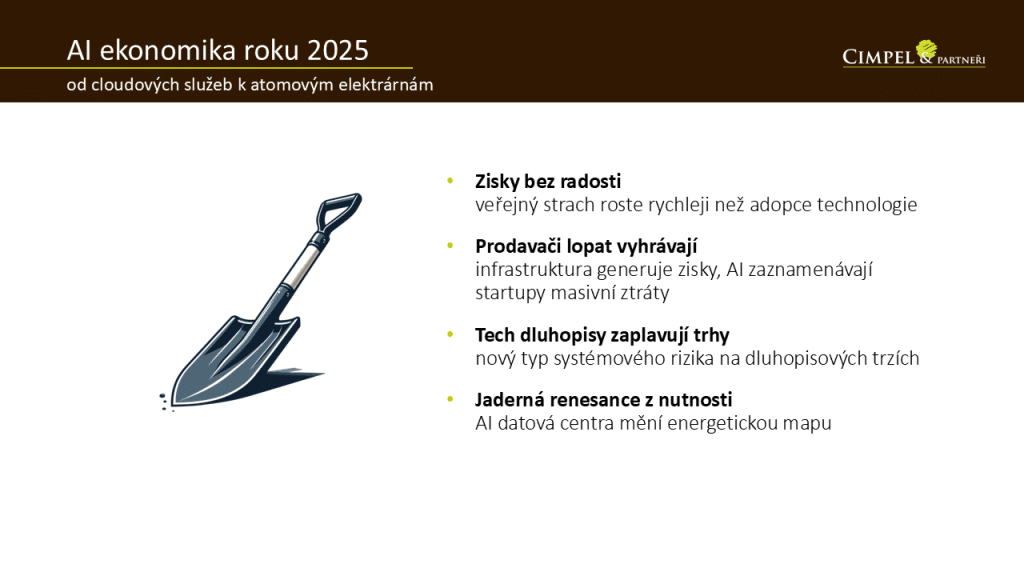 Dan: Z mého pohledu bychom se neměli dívat na to, jestli tam bublina je, nebo není. V době dotcom se financoval hlavně marketing. Skutečná hodnota, která po splasknutí bubliny zůstala, byly kabely na dně oceánu a to, že používáme internet. Dnes se financuje infrastruktura – peníze tečou do datových center, zdrojů, čipů. To jsou všechno reálná aktiva, která, i kdyby tam bublina byla a splaskla, zůstanou a mají dlouhodobé využití.