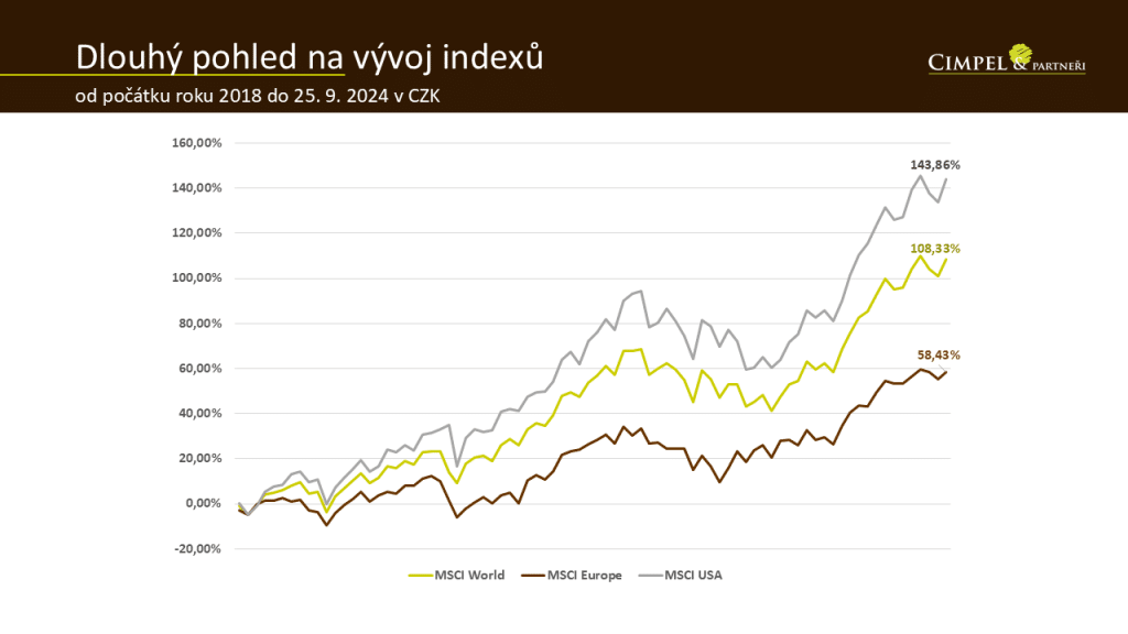 Dan: Jak jsi zmínil, z dlouhodobého pohledu se krátkodobé výkyvy, které jsou běžné, trošku vytrácí. Nejsou tam jednoduše vidět, ale jsou tam vidět spíš ty významnější výkyvy. Když se podíváme od roku 2018, prošli jsme si v březnu roku 2020 covid, pak rok 2022 a návratový rok 2023. To jsou větší vlny v dlouhém horizontu, ale ani ony trend nezměnily. Dnes jsme zase na těch téměř nových maximech i v korunovém vyjádření a krátkodobé zoubky tam skoro nevidíme. Když se podíváme na čísla, je to 140 % od roku 2018 na americkém trhu, o něco níž je světový trh na 108 % a Evropa v tomhle trochu zaostává, je na 58 %, ale je také kladná, má pozitivní trend.