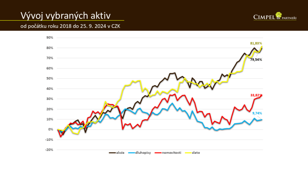 Jiří: Když se podíváme na další aktiva, můžeme vidět zajímavý fenomén posledních let. Žlutá čára ukazuje vývoj kurzu zlata, které se od roku 2018 drží na úrovni výnosu srovnatelném s akciemi. I v září jsme viděli posílení kurzu zlata v reakci právě na pokles úrokových sazeb americké centrální banky. Přičítáme to určité nejistotě na finančním trhu a takovému otazníku, jestli to snížení úrokových sazeb na straně centrální banky přišlo včas, jestli to není signál nějaké potenciální recese atd. Tedy samozřejmě mírnou nervozitu vnímáme a na to zlato reaguje pozitivně růstem. Já osobně bych ale byl opatrný ohledně spekulace na budoucí růst ceny zlata, protože růst zlata na úrovni srovnatelné s akciemi není běžnou situací. Určitě to není běžné tempo, kterým zlato posiluje. Proto bych si pokládal otázku, kdy zlato dosáhne pomyslného maxima, po kterém přijde dost pravděpodobně nějaké silnější vydechnutí.