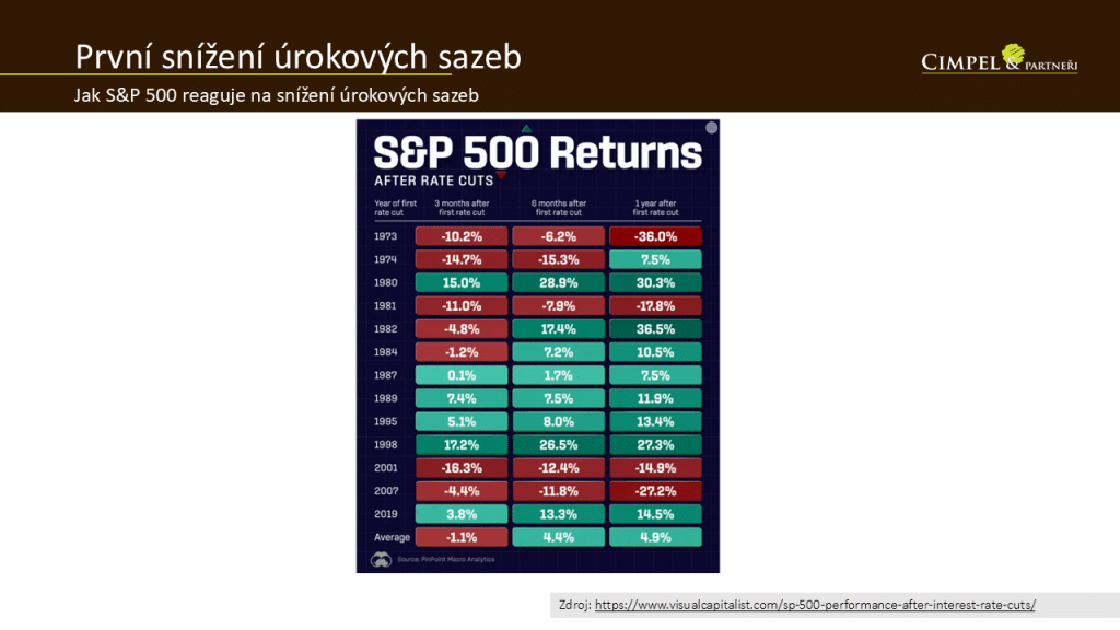 Dan: Došlo k prvnímu snížení úrokových sazeb po 4 letech, to znamená poprvé od doby, kdy FED začal zvyšovat úrokové sazby a pak je delší dobu držel ve vyšší hladině. Teď přichází cyklus snížení a je to první krok o půl procentního bodu. Je zajímavé podívat se, co to historicky znamenalo hlavně pro akciové trhy, které na to bývají poměrně citlivé. Infografika od Visual Capitalist krásně ukazuje, že historicky od roku 1973 velká část těch prvních snížení úrokových sazeb končila nějakým mírně negativním trendem. Pokud se ale podíváme trochu dál na 6 až 12 měsíců po prvním snížení, většina těch let nakonec dopadla pozitivně. To znamená průměrný růst, když bychom udělali jen obyčejný průměr, byl 4,3 %. Pokud nenastane vyloženě recesní období, jako můžeme vidět roky 2001, 2007 a rok 1973, které byly negativní z důvodu nějaké hlubší recese, můžeme také očekávat růst. Recese nás může vždy překvapit, nemůžeme říct, že nepřijde, ale zároveň aktuální ukazatele recesi úplně nenasvědčují.