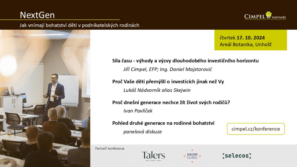 V závěru bychom vás rádi pozvali na akci, kterou pořádáme každý rok na podzim. Letos poprvé jsme se rozhodli otevřít naši klientskou konferenci i menšímu počtu lidí z veřejnosti. Ať už jste naším klientem, nebo nejste, akce je otevřená. Klienti se mohou registrovat zdarma prostřednictvím odkazu, který jsme jim poslali. Pro neklienty je cena necelé 2 000 Kč. Pro nás je jedno ze základních poslání, které máme jako firma, že pomáháme našim investorům dávat jejich rodinnému bohatství smysl. Většinou využívají majetek sami pro sebe, to znamená pro nějakou svoji rentiérskou fázi života, kdy z majetku čerpají prostředky pro svou rentu. Pokud je čerpají tak, jak je většinou čerpají, to znamená formou nekonečné renty, kdy vybírají jenom část výnosů a nevybírají vklad, který postupně do svého majetku dávali, majetek po nich samozřejmě jednoho dne zbyde. Proto téma NextGen, to znamená pohled na tu další generaci a na to, jak ona vnímá bohatství a jak by si vlastně představovala strukturu bohatství, které na ni jednoho dne třeba přejde, vnímáme jako velmi důležité. Je to velmi časté téma, které řešíme s našimi klienty, a proto jsme tu letošní konferenci zaměřili právě na toto téma.