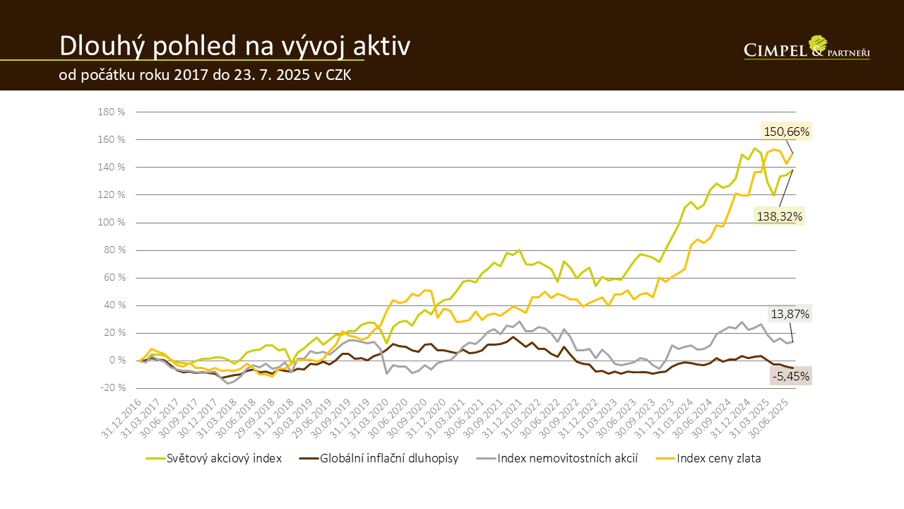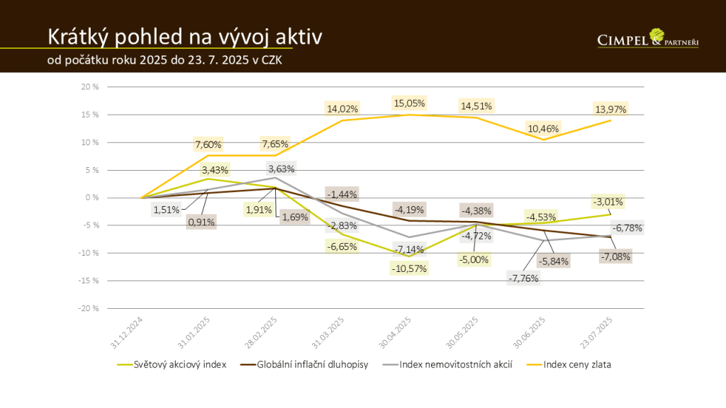 Z pohledu dalších aktiv je jednoznačným vítězem od začátku letošního roku stále zlato, které je +14 % i v korunovém vyjádření. Je to díky věčně se opakujícímu tématu nejistoty na trzích v důsledku toho, co se děje ve světě, ať už z pohledu geopolitických rizik či celních opatření. Uvidíme, kde to bude mít konce, to nyní nebudu hodnotit. Ostatní aktiva jsou v korunovém vyjádření záporná, což znamená světové akcie −3 %, inflační dluhopisy −7 % a nemovitosti (akcie nemovitostních společností) necelých −7 %.