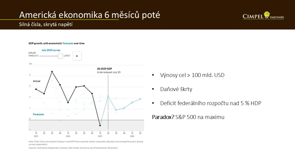 Nyní téma americké ekonomiky 6 měsíců poté, co Trump zavedl svá extrémní protekcionistická opatření v oblasti celní politiky. V posledních dnech se diskutuje, jestli dojde k nějaké dohodě, hodně se řeší, že se dohodl s Evropou. Termín, který dal ostatním zemím, je 1. srpna. Uvidíme, kde bude skutečnost, jestli bylo nebo nebylo něco z toho, o čem spekulují média, potvrzeno. Sám jsem zvědavý, kde se nakonec potkáme, jestli to budou ta 15% cla, o kterých se poslední dobou mluví, nebo ne. (Tento komentář připravujeme těsně před koncem července.)