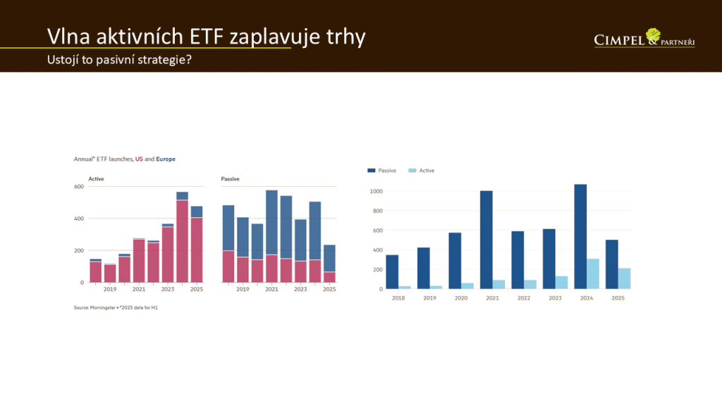 Z našeho pohledu je to určitý trend, který je v pořádku, ale my i nadále pořád souzníme s tou pasivní strategií, protože existuje celá řada studií a stále dokola se potvrzuje, že pouze minimum aktivních správců zvládá překonávat trh. Z našeho pohledu je důležité jádro portfolia stavět právě na pasivních strategiích, být na trhu a jet na vlně indexů bez snahy spekulovat. Případné aktivní fondy nebo aktivní správce nám dává smysl do portfolií doplňovat jako doplněk, který může pomáhat jádru, které je do určité míry pasivní.