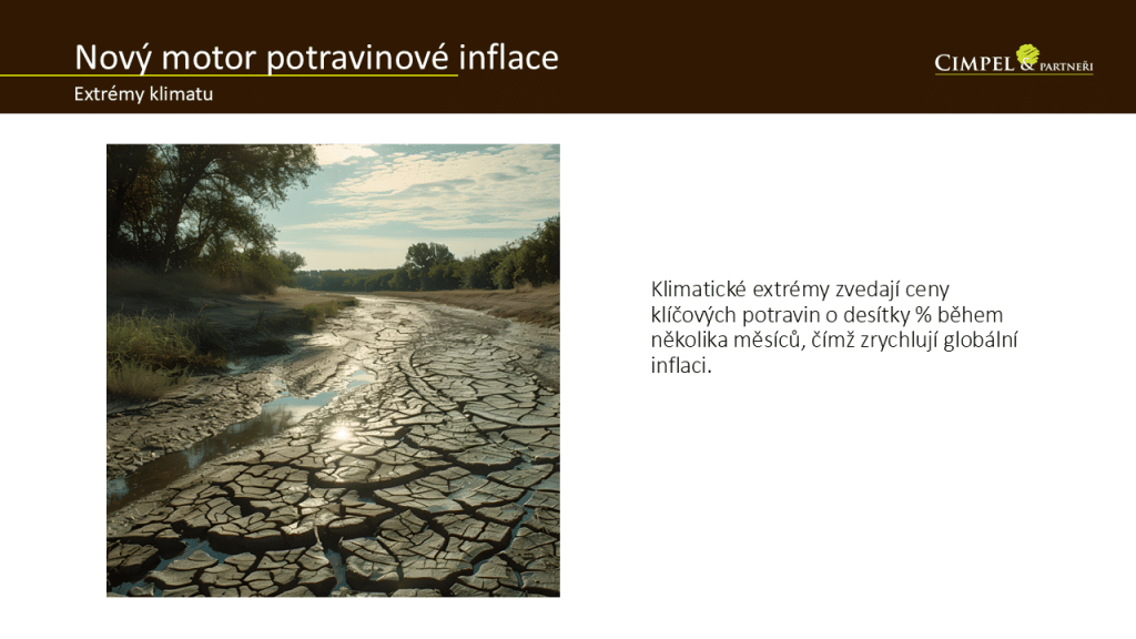 Jako poslední téma bych chtěl zmínit extrémní klima a to, jak se může promítnout do inflace, která je jedním ze stěžejních témat všech centrálních bank. Extrémní klima může způsobit zvýšenou inflaci skrze potraviny. Potravina je jedna ze základních produktů, který spotřebováváme. Vyspělých ekonomik, kde je více silněji ekonomicky postavených domácností, se to nedotkne tak razantně, ale v rozvíjejících se zemích a na rozvojové trhy to dopadá velmi zásadně. Pro nízkopříjmové skupiny obyvatel se určité potraviny mohou stát nedostupné nebo příliš drahé, čímž po nich klesá poptávka. Abyste si udělali představu, co způsobila extrémní sucha v letech 2022–2024, tak třeba cena olivového oleje v Evropě po suchu v Andalusii vzrostla o 50 %. Cena cibule v Indii, jinak tak běžné suroviny, při loňských vedrech vzrostla o 89 %. To je něco, co se nenápadně vlévá do spotřebitelských košů a může to tlačit inflaci a může to být i důvodem, proč centrální banky chtějí být opatrnější.