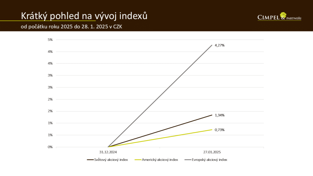 Při pohledu na lednový výsledek akciových indexů můžete vidět, že po mnoha měsících jsou vítězi evropské akcie, které dosáhly výnosu přes 4 %. Americké akcie s necelým jedním procentem tentokrát nepředčily Evropu, jak jsme v posledních měsících byli zvyklí, a to především díky poklesu amerického dolaru. Globální akciové indexy se pohybují na úrovni přes 1 % výnosu.