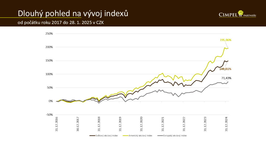 Dan: Vždy je dobré dívat se na výsledky v dlouhodobém horizontu. Vidíme dva krásné po sobě jdoucí roky 2023 a 2024, které zakončily významně plusovým dvouciferným růstem. Je to dáno nestandardním obdobím, kdy jsme si v předešlých letech prošli významnými událostmi, ať už covidem nebo výraznými poklesy v roce 2022. Tyto dva návratové roky dopadly, troufnu si říct, nad očekávání všech analytiků, jakkoliv byli optimističtí. Lednový pohyb směrem dolů zvlášť na amerických technologických akciích je z dlouhodobého pohledu nepatrný.