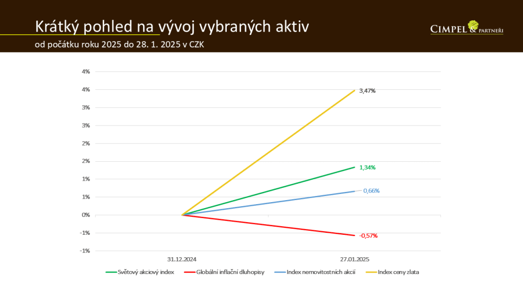 Akcie samozřejmě nejsou jediným aktivem, které byste v portfoliu měli mít. Co se týče vývoje dalších aktiv, můžeme vidět, že druhým vítězem začátku letošního roku je zlato, které dosáhlo výnosu na úrovni necelých 3,5 %. Zlato v této chvíli těží z tržní nejistoty ohledně dalšího směřování Spojených států, zvlášť z očekávání, jak se bude vyvíjet politika a ekonomické aktivity nového amerického prezidenta. Je to určitá nervozita, která ceně zlata vždy nahrává.