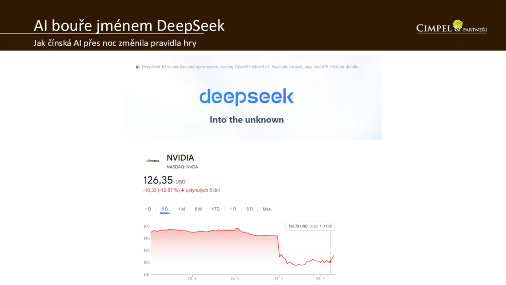 Dan: Leden byl významný hlavně pro technologické akcie, které ovlivnily celkový vývoj ať už světového, tak hlavně amerického indexu spíš negativním směrem. Zásadním faktorem bylo už zmiňované ohlášení nové AI jménem DeepSeek, kterou vyprodukovali v Číně. Reakce na uvedení této nové AI byla tak významná hlavně proto, že by měla zásadně překonávat stávající AI modely jako je ChatGPT apod, k čemuž ale využívá horších technologií, horších čipů, nepotřebuje ty nejnovější, nejsilnější čipy. Toto byla zajímavá informace, na kterou zásadně zareagovala například i námi v posledních měsících několikrát zmiňovaná akcie Nvidia, která velmi významně poklesla, což můžete vidět na tomto grafu.