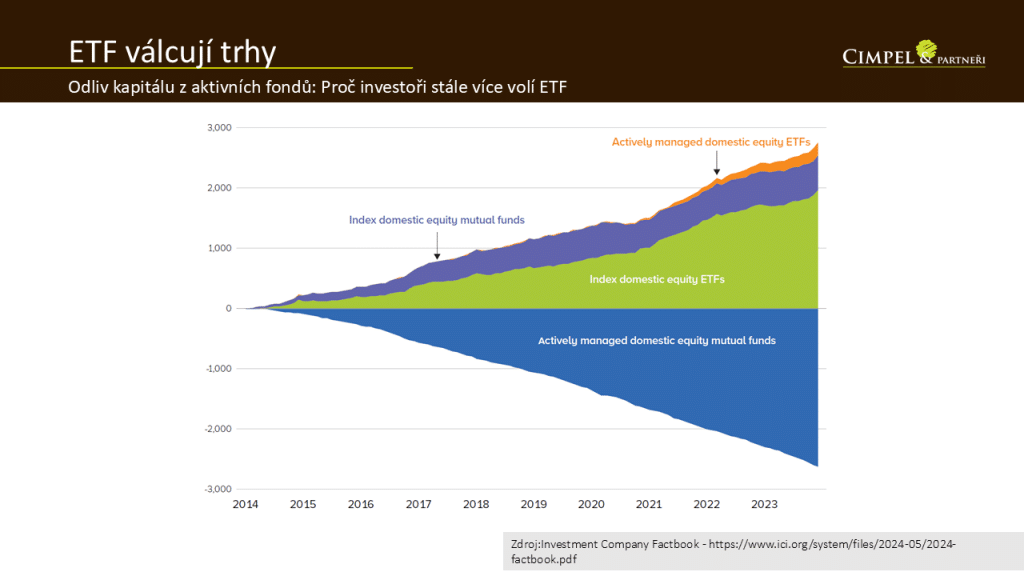 Naší poslední aktualitou je pohled na globální systematický odliv aktiv z aktivně spravovaných fondů, který probíhá od roku 2014. V Česku je známe často jako podílové fondy, které vám distribuují třeba banky nebo finanční poradci. Většina trhu z těchto fondů postupně odchází, a naopak vidíme velký příliv nových aktiv do pasivně spravovaných fondů. To jsou kategorie pasivních indexových ETF fondů, případně třeba indexových podílových fondů nebo se v posledních třech letech na trhu objevuje i nabídka aktivně řízených ETF fondů.