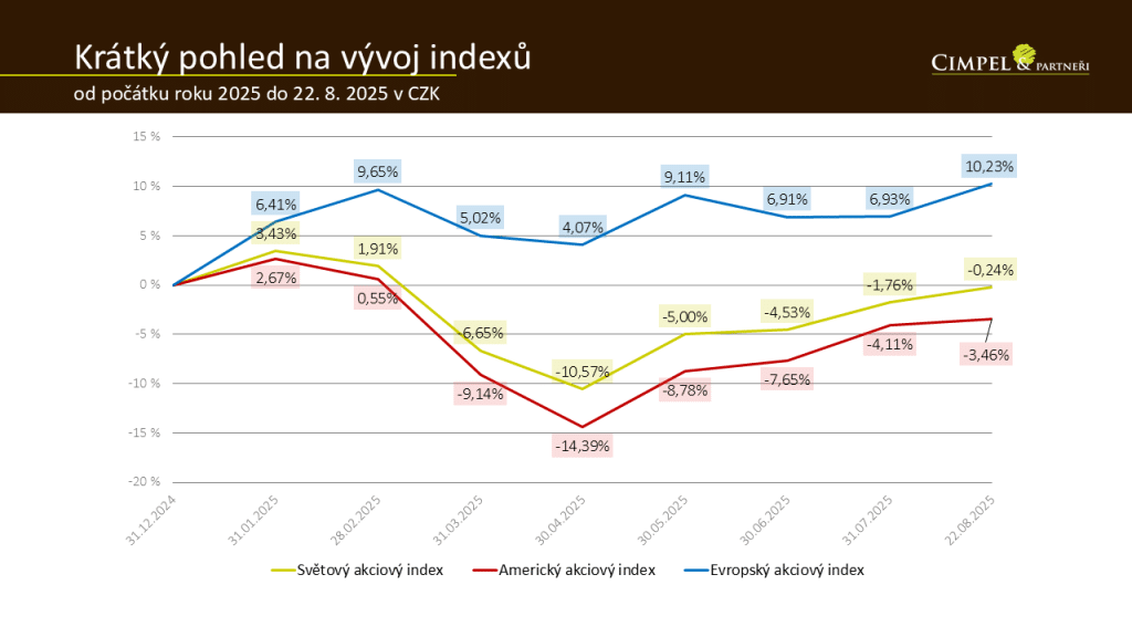 Dan: Pokud bychom se koukali bez měnového vlivu, můžeme připočíst v podstatě 15 % k americkému indexu a do velký míry i k tomu světovému. Tím se Amerika dostává opět do popředí. Tento graf, jak ho vidíme, neříká, že by se americkému trhu nebo světovému akciovému indexu nedařilo, ale ukazuje nám, jak se indexy pohybují při přepočtu do české koruny. Dolar oslabil od původně nejvyššího kurzu zhruba o 15–17 %, což zásadně ovlivňuje výsledek.