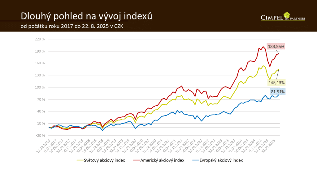Dan: Na jednu stranu má i zde poměrně významný vliv měna, tedy přepočet do koruny. Na druhou stranu, přestože v krátkém pohledu americký akciový index oproti evropskému zaostává, při tomto dlouhém pohledu je to naopak, 183 % pro americký akciový index versus 81 % pro Evropu. Z mého pohledu na základě nějakých fundamentů, na kterých je to postavené, si myslím, že v následujících letech nemá Amerika důvod zásadně ztrácet svůj náskok.