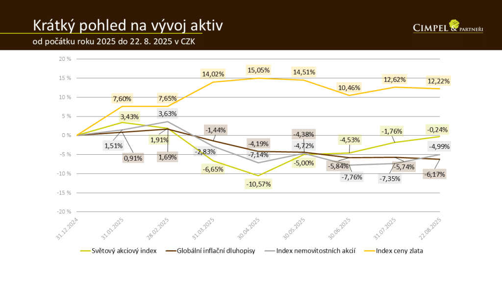 Jiří: Vítám vás u dalšího dílu Aktualit z finančních trhů, tentokrát se podíváme, jak se dařilo finančním trhům v měsíci srpnu. Samozřejmě pro vás jako vždy máme připraveno i pár aktuálních témat, která o prázdninových měsících hýbaly trhy. Moje jméno je Jiří Cimpel a se mnou je tady jako vždy Dan Majstorović, náš analytik a společník ve firmě.