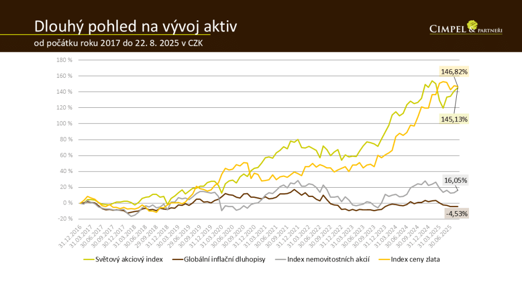 Jiří: Jelikož my ani většina investorů neinvestujeme jenom do akcií, podívejme se i na další aktiva. Mně na tomto grafu už druhý rok po sobě vždy upoutá index ceny zlata, který je, a i v minulých letech byl, vlastně vítězem. Paradoxně se i v dlouhém horizontu drží na výnosu akciových indexů. Znovu se vrátím k té otázce: je to něco, co vnímáš, že je nový fenomén? Bude zlato takovýto výkon dělat dlouhodobě?
