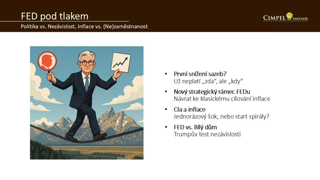 Jiří: Vynechme nyní fundamenty, tedy byznysy firem, které se nám do výsledků promítají dlouhodobě, a podívejme se, co dalšího hýbe finančními trhy. Jedním z významných hráčů jsou centrální banky. Investoři hodně sledují, jak centrální banky reagují na aktuální situaci. V srpnu jsme viděli, že se americká centrální banka, Fed, dostává znovu pod velký tlak ze strany Donalda Trumpa, který není úplně spokojený s její politikou. Tak zkus okomentovat, co by si Trump představoval, co je to jeho očekávání od Fedu a co naopak můžeme ze strany Fedu reálně čekat.