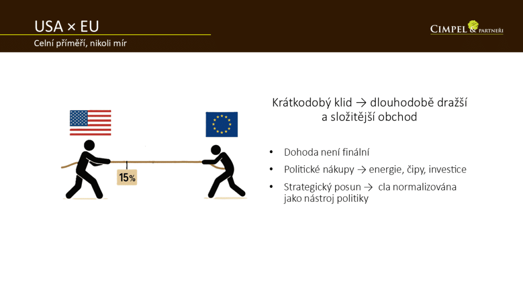 Dan: To nejzásadnější je, že na většinu dovozu z Evropy do Ameriky se stanoví jednotná cla 15 %. Týká se to asi 70 % veškerého dovozu z EU do Ameriky. Co je velmi citlivé pro Evropu, je automobilový průmysl. Toho se to týká také, ale jsou tam nějaké další podmínky, které mají být dodrženy. Dneska jsou cla 27,5 % na automobilový průmysl, jak dovoz aut, tak součástek. Nově by to mělo být těch 15 %, poté co Evropa naplní slíbené politické podmínky – odběr energií, příslib investic v Americe nebo podpora investic Evropských firem v Americe.