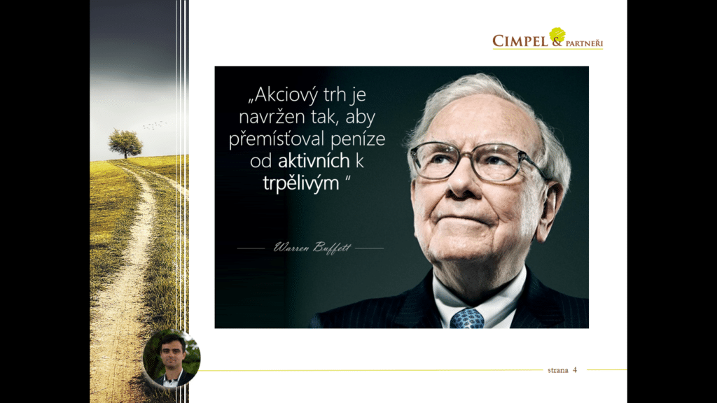 Jiří: Můžeme se poučit od Warrena Buffetta, vzít si jeho citát a říct asi to, že doporučujeme, abyste nebyli tím aktivním investorem, ale byli jste tím trpělivým investorem. My trhy nečasujeme a primárně doporučujeme to, abyste na těch trzích skutečně byli. I přes to, že samozřejmě budou přicházet výkyvy, jako v minulosti.