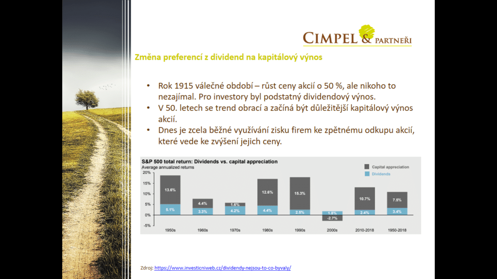 Je dobré říct, že v průběhu času se změnila spousta věcí, jednou z nich byly daňové zákony a pro toho klasického investora dnes (speciálně českého) je výrazně zajímavější vybírat si ten svůj zisk, ne ve formě dividendy, ale postupným odkupem těch svých aktiv. Protože dividendu daníte jak na straně firmy, tak na straně Vás jako investora, takže musíte počítat, že ten zisk bude řádově o 30 % nižší, na rozdíl od toho, když vybíráte svůj zisk ve formě odkupu, pak jste po 3 letech od té daně osvobozeni. A jestli mít nebo nemít 30 % se mi zdá jako významná částka.