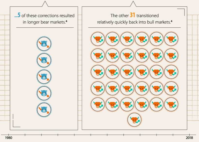 Na obrázku níže vidíte, že od roku 1980 do roku 2018 americké akcie zažily celkem 36 korekcí a jen z 5 z nich se nakonec vyklubal začátek medvědího trhu . Taková pravděpodobnost úspěchu 6:1 je pro sázející ve sportce snem!