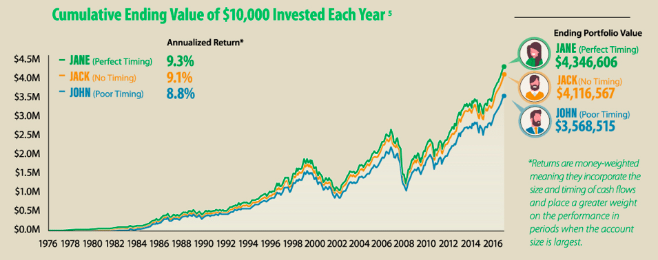 I přesto, že Jane byla v časování svých investic zcela neomylná a vždy zainvestovala v tom nejlepším okamžiku, rozdíl mezi ní a Jackem, byl po 40 letech investování velmi malý. Hlavní vliv na výsledek jejich investice měl čas, který na trhu jejich peníze strávily – protože ze svých vložených 400.000 Kč dostali po 40 letech více než desetinásobek.
