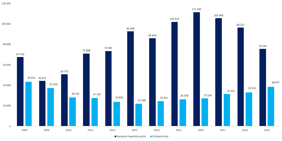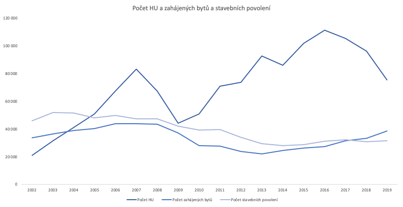 Graf níže ukazuje, jak rostl počet nově sjednaných hypoték a počet bytů, které se v daném roce začaly stavět. Vidíme zde, že počet hypoték většinou násobně převyšoval počet nově stavěných bytů, v některých letech i více než čtyřnásobně. To znamená, že kupující masivně investovali do nákupu starších bytů. Díky tomu významně rostly ceny nejen nových bytů, ale i těch starších.