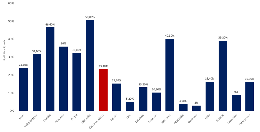 Historicky je Česká republika zemí, kde jsme zvyklí nemovitosti vlastnit. Na grafu níže vidíme, že jen 24 % lidí u nás bydlí v nájmu. U našich sousedů jsou tyto poměry podstatně vyšší, v Německu 50 % a v Rakousku 40 %.