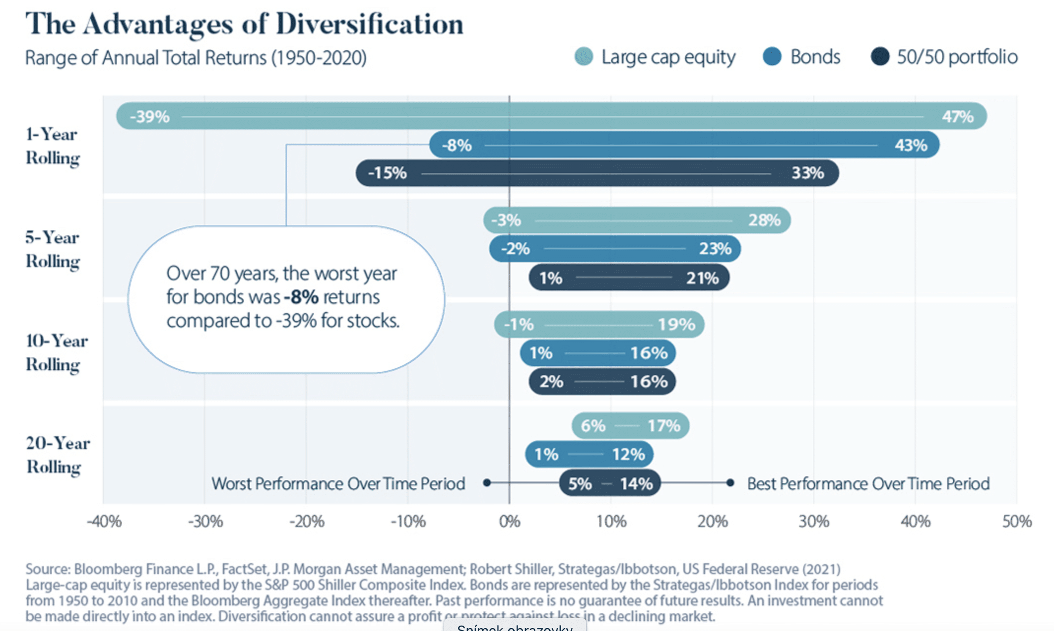 Do hotovosti patří rezerva a peníze, které v dohledné době měsíců nebo jednotek let chcete utratit. Pokud ale investujete s horizontem 5 let a více, musíte již hledat způsoby, jak inflaci dlouhodobě s jistotou porazit. Na grafu níže je krásně vidět, že čím delší investiční horizont máte, tím menší je riziko, že vaše investice prodělá.
