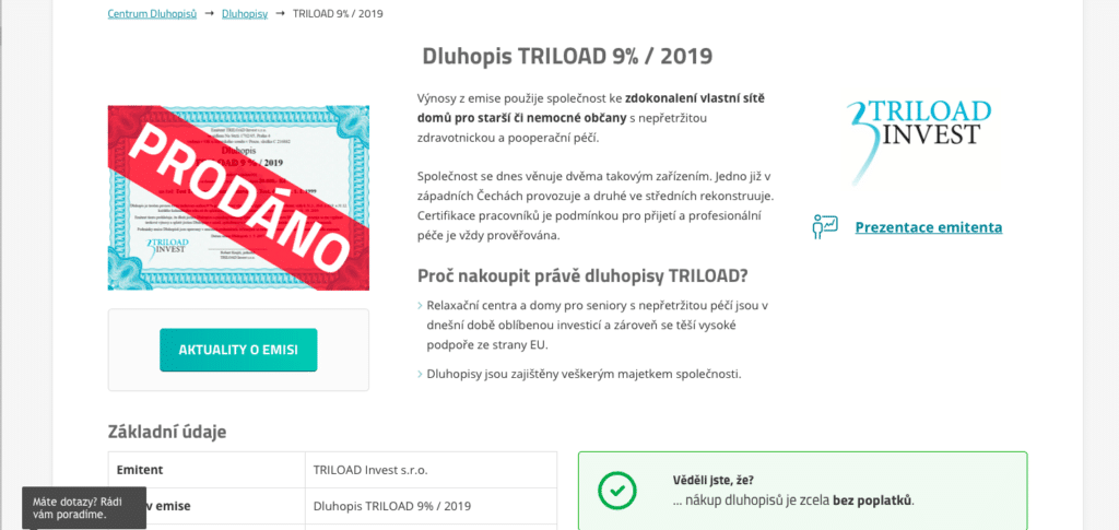 Tato společnost si napůjčovala 24 milionů na opravu domů pro seniory a koncem loňského roku přestala své závazky splácet. Emise dělala přes portál Dluhopisy.cz, kde nabízela extrémně vysoké úroky – až devět procent. Proto snadno dokázala najít dost lidí, kteří jí své peníze svěřili. Věřitelé v tomto případě pravděpodobně přijdou o většinu svých vkladů.