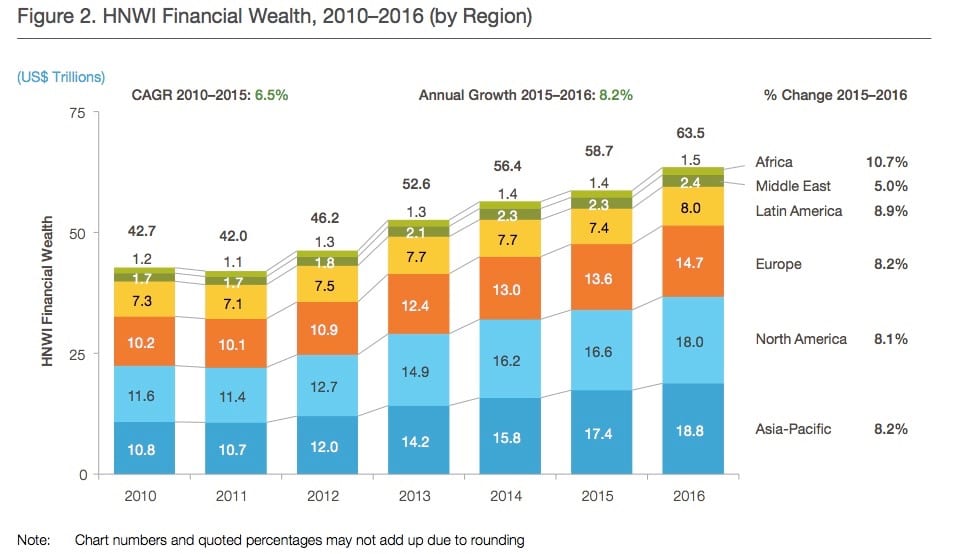 Zpráva ukazuje, že počet dolarových milionářů meziročně vzrostl o 7,5%, v roce 2015 to bylo o 4,9%. A jejich celkový majetek byl o  8,2% meziročně větší. Překvapivým skokanem roku mezi zeměmi bylo Rusko, které rostlo nejrychleji ze všech zemí, počet milionářů zde narostl o 20% a stejně se i zvětšil jejich majetek. V Evropě je dolarových milionářů o 4,5% více a jejich majetek narostl nejvíce za poslední roky a to o 14,7%.
