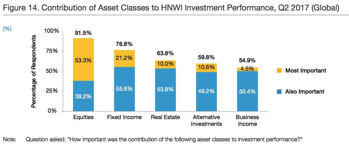 Na otázku: “ Jak důležité bylo přispění jednotlivých tříd aktiv k růstu vašich investic?“ odpovídali nejbohatší lidé následovně. Z grafu je vidět, že největší váhu přikládají růstu akciových investic, následně příjmům z dluhopisů a na třetím místě řadili příjmy z nemovitostí. Je zajímavé že příjmy z vlastních firem, řadili až na poslední 5, místo.