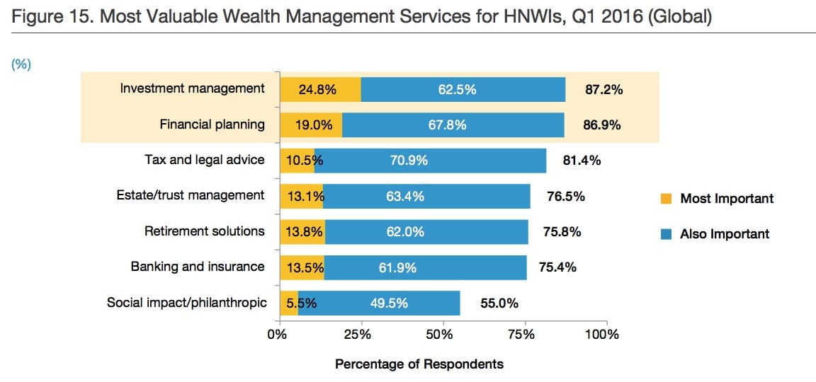Poslední obrázek dělá radost nám, investičním poradcům. Ukazuje, že pro bohaté lidi z celého světa jsou nejdůležitějšími službami spojenými s jejich majetkem – Investiční management a finanční plánování. Překvapivě teprve až za nimi se řadili služby daňových poradců a právníků. V praxi vidím i u našich klientů, že se nejprve radí o řadě věcí souvisejících s daňovou optimalizací nebo dědictvím s námi a pak teprve oni, nebo často přímo my, zadáváme konkrétní požadavky právníkům a daňovým poradcům.