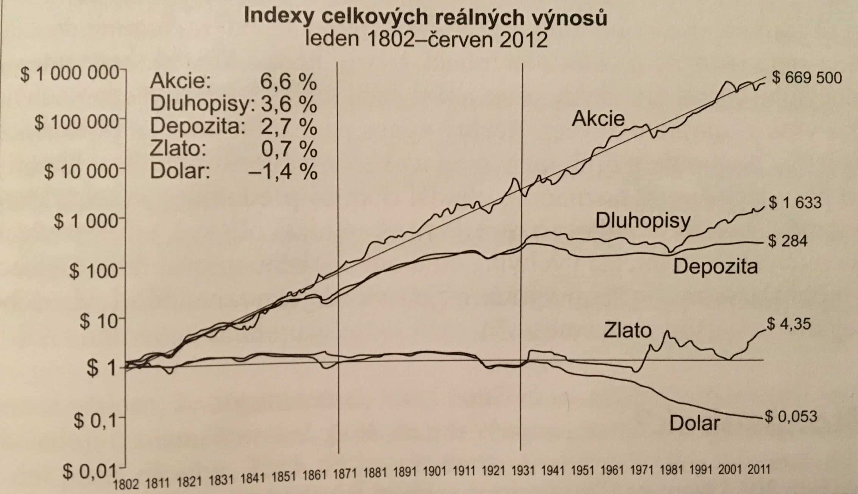 - Pravděpodobnost velkého výnosu je prakticky nulová, pokud budeme držet hotovost, dluhopisy nebo zlato. Musíme kupovat akcie!