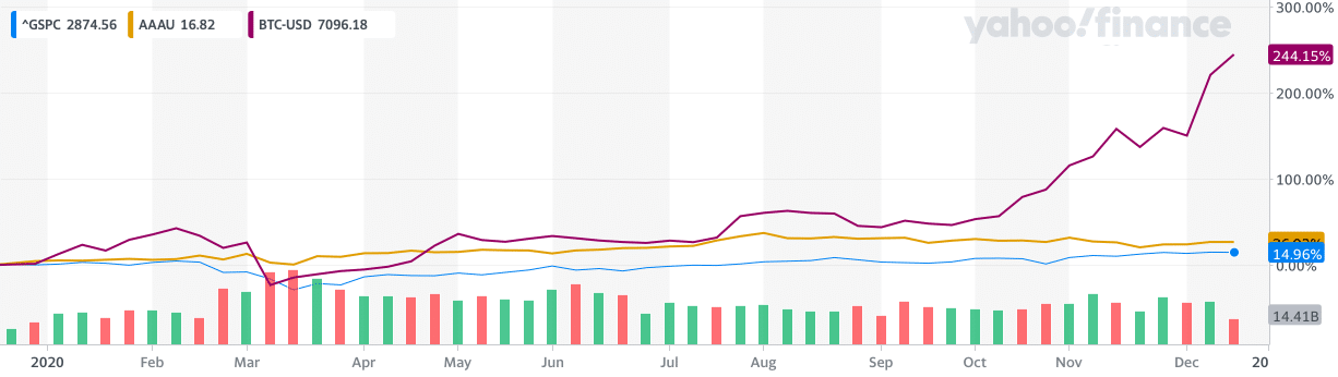Vývoj ceny Bitcoinu v letošním roce ve srovnání s růstem akcií (modrá) a zlata (zlatá)