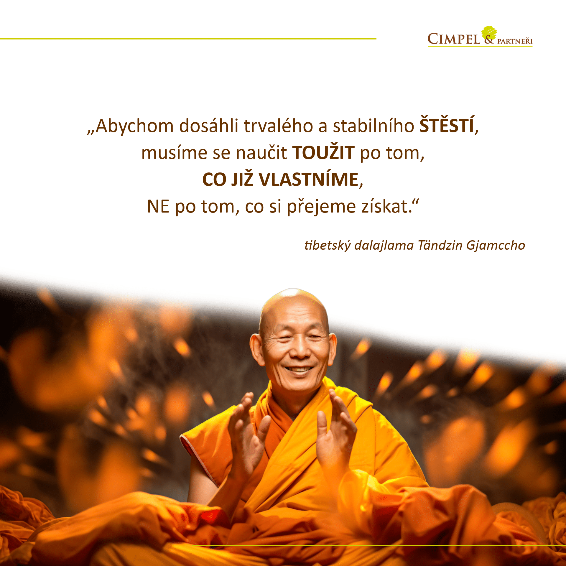 Trefně tuto myšlenku uchopil tibetský dalajlama Tändzin Gjamccho: „Abychom dosáhli trvalého a stabilního štěstí, musíme se naučit toužit po tom, co již vlastníme, NE po tom, co si přejeme získat.“