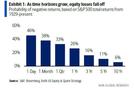 Pokud je váš investiční horizont mnoho let, zapomeňte, že své portfolio budete sledovat na denní bázi. Pokud totiž budete svou investici každý den sledovat a VYHODNOCOVAT, tedy přemýšlet, jestli je dobrá, nebo ne, je váš reálný investiční horizont jeden den, protože dál se svou investicí nevidíte. Na denní bázi totiž budete realizovat ztrátu se 46 % pravděpodobností a to už může být hodně stresující.