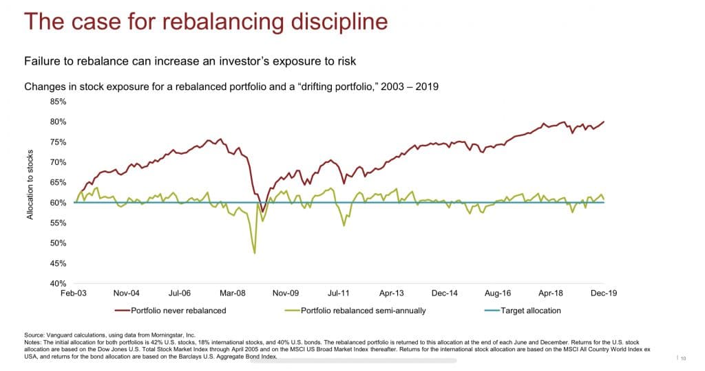 Na obrázku vidíte, že v roce 2003 bylo v portfoliu umístěno 60 % do akcií. Kdybyste portfolio pravidelně nerebalancovali, tvořily by akcie v roce 2008 díky jejich předchozímu růstu víc než 75 % vašeho portfolia, což s sebou nese větší rozkolísanost celé investice a větší ztráty při propadu. Proto se pravidelná kontrola portfolia a jeho průběžné rebalancování rozhodně vyplatí!