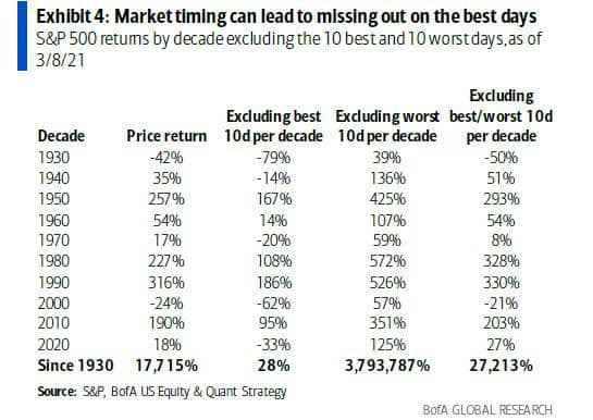 Trh neroste lineárně a průběžně po celou dobu a stejně tak ani neklesá. Největší růsty nebo poklesy se většinou dějí v řádech několika málo dní. Pokud ve snaze investici správně načasovat takové dny minete, protože zrovna držíte hotovost a čekáte na pokles, připravíte se o velkou část svého výnosu. Na obrázku vidíte, jak velký vliv na výsledek vaší investice má pouze to, zda do jejího zhodnocení zahrnete nebo nezahrnete 10 nejlepších nebo naopak nejhorších dnů.
