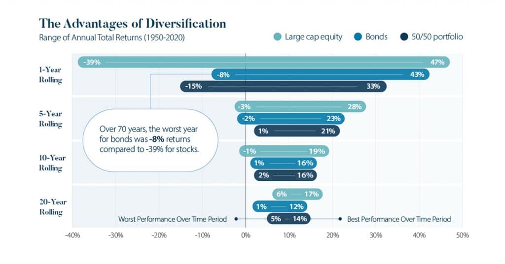Cílem správné diverzifikace vašeho portfolia je diverzifikovat (rozložit) rizika. Nechcete například vlastnit jen jednu akcii nebo dluhopis konkrétní společnosti, protože v případě jejich úpadku můžete přijít o celou svou investici. Proto diverzifikujte mezi více konkrétních společností, čím více jich je, tím větší máte jistotu, že o své peníze v budoucnu nepřijdete. Právě proto v našich portfoliích využíváme pasivní ETF fondy, které v sobě automaticky drží často i tisíce různých akcií, dluhopisů, nemovitostí apod.