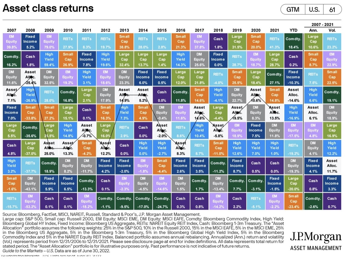 Je důležité oddělit od sebe emoce spojené s „krátkodobými“ poklesy a dlouhodobou strategií. Často totiž platí, že právě nejvíce volatilní aktiva nesou dlouhodobě nejvyšší zhodnocení. Dobře je to vidět na analýze od J.P.Morgan