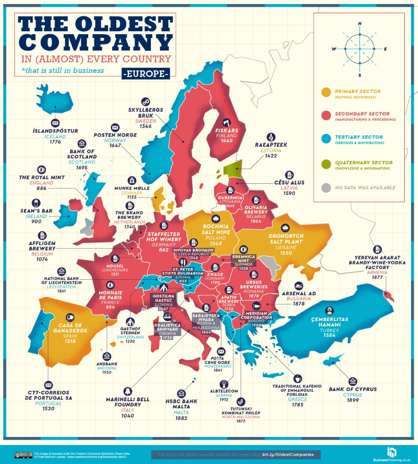 Jednou z nejstarších evropských firem je německá destilérka a vinařství – Staffelter Hof, která byla založena již v roce 862 n. l. Firma existuje skutečně více než 1 100 let! Dodnes stále provozují stejný business a můžete se u nich i ubytovat.