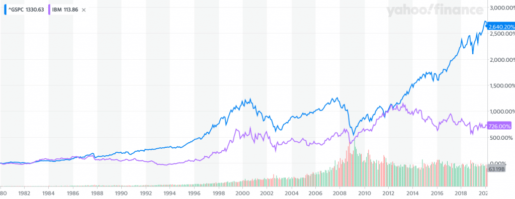 Na obrázku níže jsem připravil srovnání, jak se dařilo akciím největší firmy z roku 1980 – IBM (fialová) ve srovnání s vývojem celého indexu S&P 500 (modrá). Vidíte, že investor, který se nesnažil akcie v roce 1980 vybírat, ale koupil celý index S&P 500, je na tom dnes čtyřikrát lépe než ten, který koupil a držel po celou dobu akcie IBM!