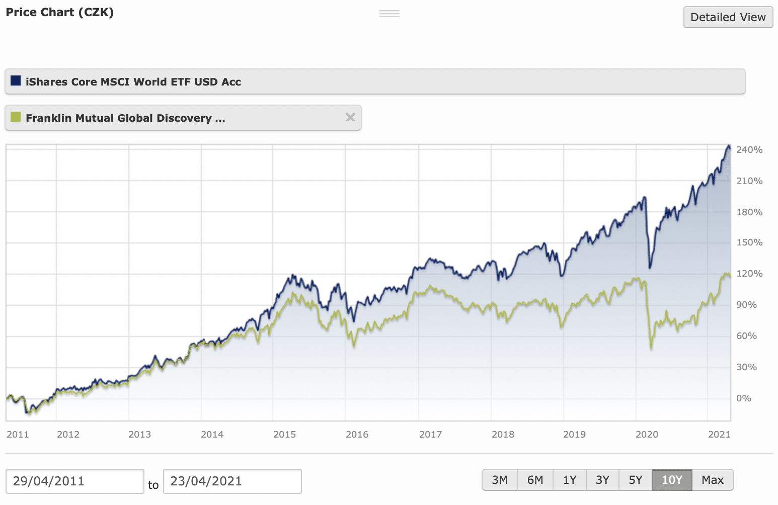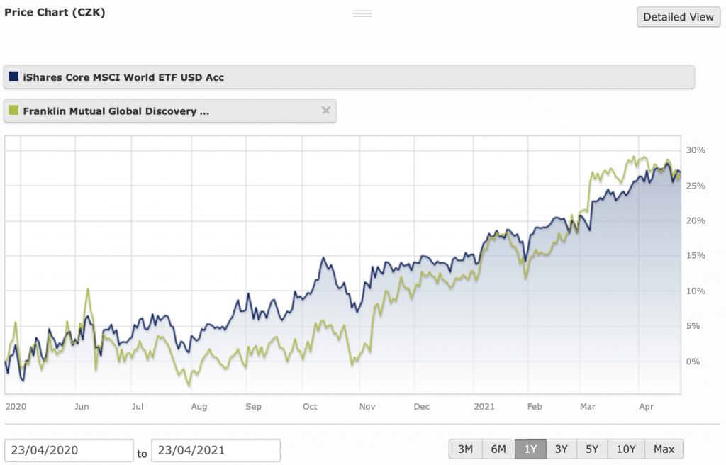 Jedním z takových fondů je i v Čechách oblíbený fond Franklin Mutual Global Discovery spravující přes 500 milionů USD spadající pod Franklin Templeton. Na grafu níže můžeme vidět, že v posledních 10 letech svou výkonností významně zaostal za růstem globálního akciového indexu MSCI World (zahrnuje 1700 největších společností na světě). Výkonnost fondu byla oproti indexu poloviční! Do tohoto indexu můžete investovat například prostřednictvím ETF fondu – iShares Core MSCI World ETF. Tento ETF fond spravuje majetek ve výši 36 miliard USD.
