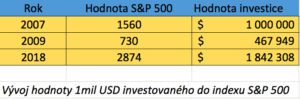 V roce 2007, kdy byly trhy před krizí na maximu, byl index S&P 500 na hodnotě 1.500 USD. V průběhu krize v roce 2009 klesl až na hranici 730 USD. To je pokles o více než 50%! Váš 1 mil., investovaný v roce 2007 do amerických akciích, se tak během dvou let změnil na pouhých 467.000 USD. Pokud jste zpanikařili a svou investici ze strachu před dalšími poklesy prodali, přišli jste nenávratně o více než polovinu Vaší investice. Pokud jste ale byli trpěliví a věděli jste, že 500 největších amerických firem, které index S&P 500 obsahuje, nemůže naráz zkrachovat a věřili jste, že po tom, co výprodejová panika na trzích přejde, hodnota indexu se zase začne postupně zvedat do normálu, pak Vám stačilo nedělat vůbec nic a jen čekat! Dnes byste, i přes ten dramatický propad, měli 1.842.000 a určitě byste nebyli naštvaní!